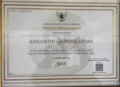 Dalam acara tersebut, Pemerintah Kabupaten Lampung Utara meraih penghargaan dalam pengisian Jabatan Pimpinan Tinggi Tahun 2023 dengan kategori BAIK.